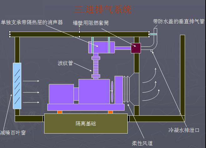4、機(jī)房應(yīng)有足夠的新風(fēng)進(jìn)口.熱風(fēng)和排煙道應(yīng)伸出室外,進(jìn)風(fēng)口應(yīng)設(shè)置在電機(jī)側(cè),排風(fēng)口設(shè)置在水箱側(cè).